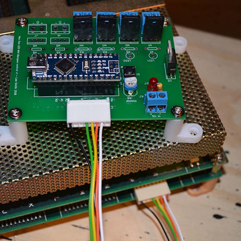 Each panel will have its own positive coloured wire and a black ground. Make sure to keep the two wires for each panel together otherwise you will have issues with wrong panel order. Once the panels are in place feed the wires to the back of the marquee section towards the location of the control board. The control board is marked with 1,2,,4 etc and + and – so just match up the colours of the panels to the number and secure with the screw terminal. You could cut the wires to size or wait until after testing.